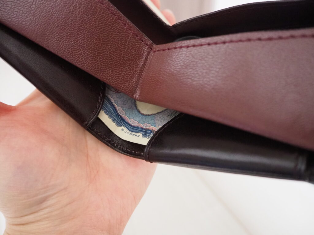 紙幣を入れる部分は片側にこのようなストッパーがついているので、財布を通過して反対側に落ちる心配もありません。